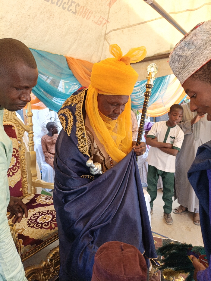The image depicts a ceremonial gathering under a white canopy tent in Gwagwarwa, Nigeria
