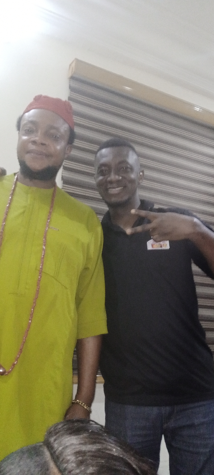 Two men pose for a photo indoors. The man on the left wears a red cap, yellow dashiki, and a beaded necklace. The man on the right wears a black polo shirt, blue jeans, and holds up two fingers in a peace sign. A small logo is visible on his shirt. A window with horizontal blinds is behind them. Part of someone's head is visible at the bottom of the frame.