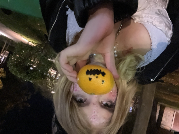 This close-up, chest-up image depicts a female subject outdoors at night in Budva, Montenegro. The female has blonde hair and wears dark eye makeup with glitter and pink speckles on her cheeks. Reddish marks are present on her upper chest and neck. She is dressed in a white garment, possibly lace-trimmed, beneath a black zippered jacket, and wears a pearl necklace with a pendant. Her right hand holds a small, round, orange fruit, painted with black triangular eyes and a jagged mouth to resemble a jack-o'-lantern, obscuring her lower face. Her visible right eye looks directly forward. The background shows artificially illuminated trees and foliage, with distant urban lights under a dark night sky.