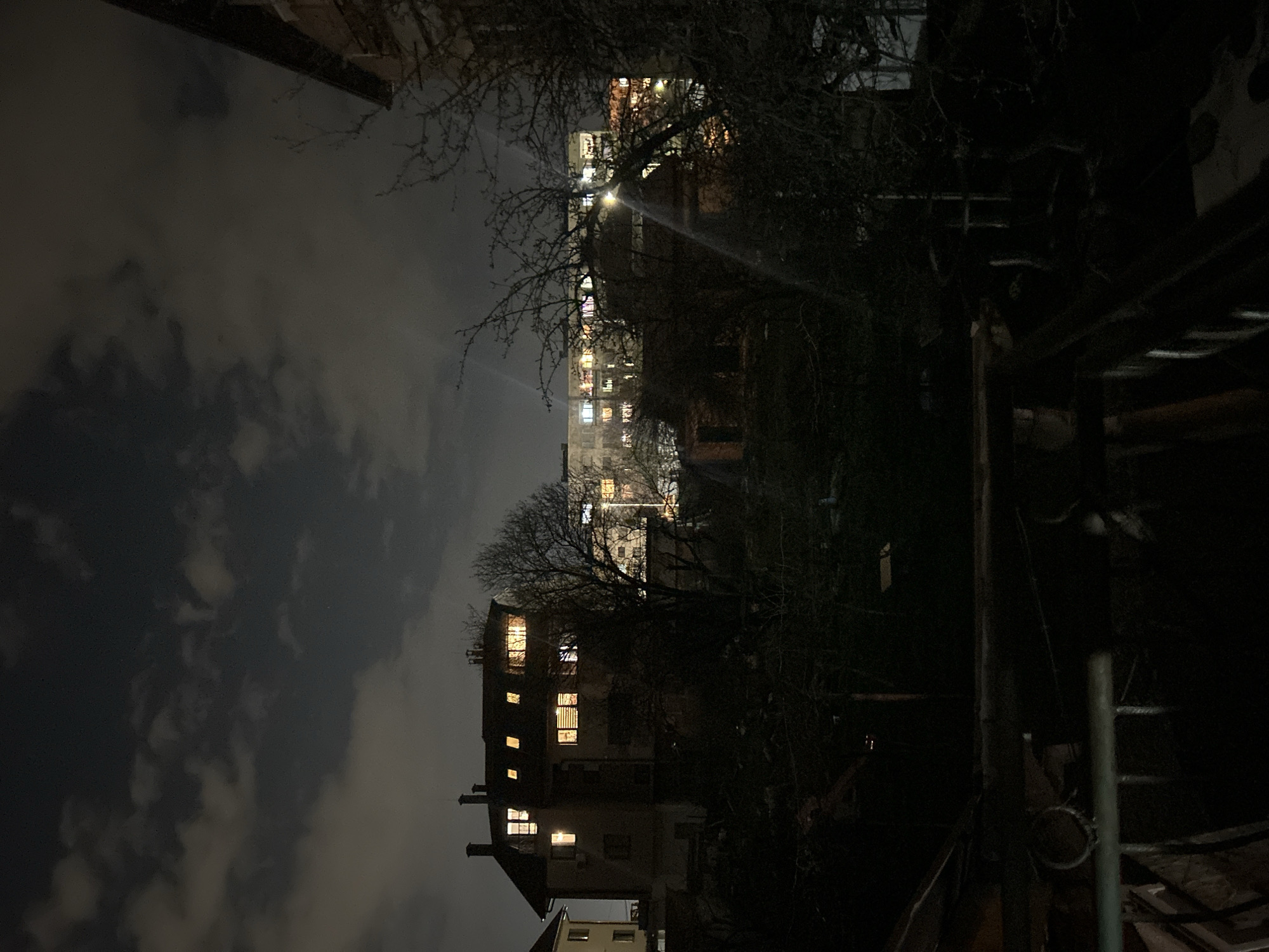 The image captures an urban environment at night in the city of Sofia, Bulgaria. The sky is dark and overcast with visible cloud formations, faintly illuminated from below by city lights. In the immediate foreground, a dark, indistinct area, possibly a garden or yard, is observed from an elevated perspective. A horizontal greenish-blue metal railing is present at the very bottom of the frame, partially obscuring the view. The midground features a three-story residential building on the left, characterized by a dark, pitched roof and three visible chimneys. Multiple windows within this building are illuminated with warm yellow light. An external air conditioning unit is mounted on its left facade. To the right of this building, a large, leafless deciduous tree stands, its bare branches forming a dark silhouette against the background. In the background, a large, rectangular multi-story apartment block is prominent, displaying numerous windows, many of which are illuminated with various colors of artificial light. The dark roofline and upper section of another building are visible on the far right edge of the frame. Scattered bare tree branches are distributed across the midground and background. No individuals are visible in the scene. Illumination is solely provided by artificial light sources emanating from within the buildings and ambient city glow.
