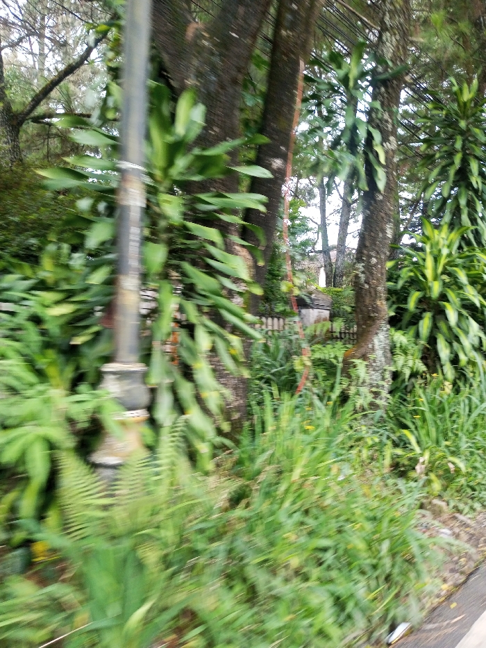 This image depicts a densely vegetated roadside scene in Batulawang, Indonesia, captured with significant motion blur