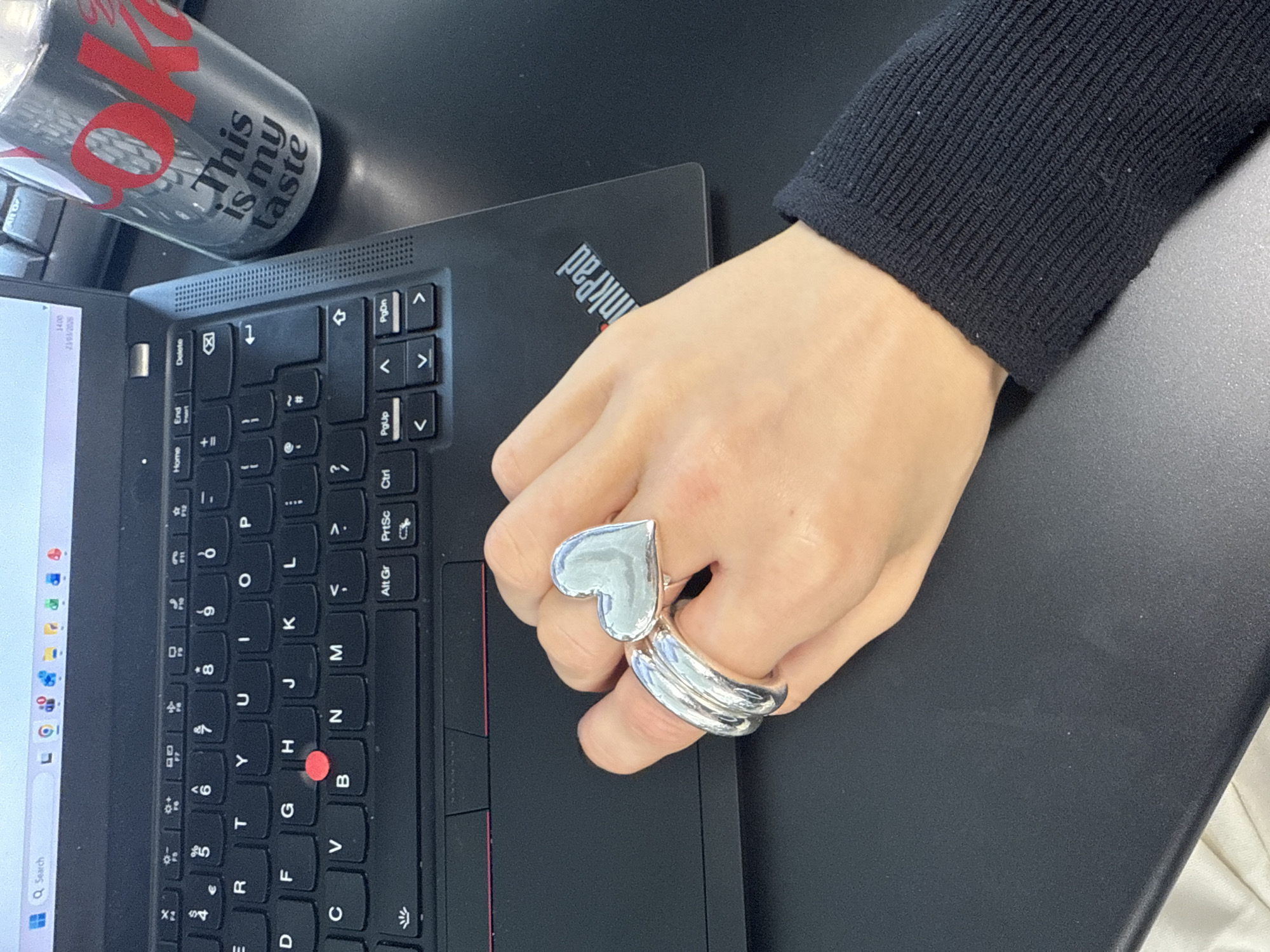 One human subject, a light-skinned right hand, is centrally positioned on a dark, non-reflective desk surface in what appears to be an indoor workspace. The hand, wearing a black ribbed knit sleeve, is adorned with two silver-colored rings on the ring finger: a prominent, polished heart-shaped ring and a thicker, multi-banded ring. The hand rests adjacent to a black Lenovo ThinkPad laptop, which is open. The laptop screen displays a typical desktop interface, including a search bar, several pinned application icons, and a system tray showing "14:00" and the date "23/03/202X". To the right of the laptop, a metallic silver-grey Coca-Cola branded can is visible, featuring "COKE" in large red lettering and the slogan "This is my taste" in white script. The specific location within the city of London, United Kingdom, is not identifiable from the visual information presented in the image.