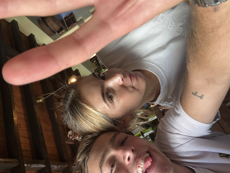 A close-up selfie depicts two young adults in an indoor setting, identified as a restaurant or wine cellar in Torres Vedras, Portugal. The male on the left, with light brown hair, displays a playful expression, mouth open with his tongue slightly extended. He wears a light-colored t-shirt. His right arm, prominently featured in the lower right and extending towards the camera, bears a small cursive tattoo reading "guga" on the inner bicep and a silver-toned wristwatch. Adjacent to him, a female with blonde hair looks directly at the camera with a subtle smile. She wears a white long-sleeved shirt with the word "ONE BIN" or "WINE BIN" faintly visible on the chest. A human hand, with fingers partially spread, occupies the upper right foreground, obscuring part of the scene. The background reveals a wooden ceiling with dark beams, two illuminated pendant lights, and on the right wall, a large wooden barrel mounted above a smaller wooden rack, with several dark glass bottles arranged vertically nearby.