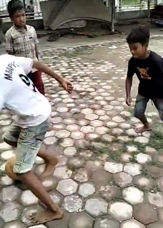 group of barefoot children playing soccer in an outdoor area. The ground is covered in hexagonal paving stones with patches of moss or grass growing in the cracks. There are three children visible who are actively involved in the game. One is wearing a white shirt and denim shorts, focusing on dribbling the soccer ball. Another is wearing a black shirt and shorts, running to keep up with the play. A third child is wearing a plaid shirt and red pants, walking into the frame. A building is visible in the background, with a corrugated metal roof and a wooden frame. A fence runs along the perimeter of the yard. The light is bright, suggesting it is daytime. The sound includes children speaking.