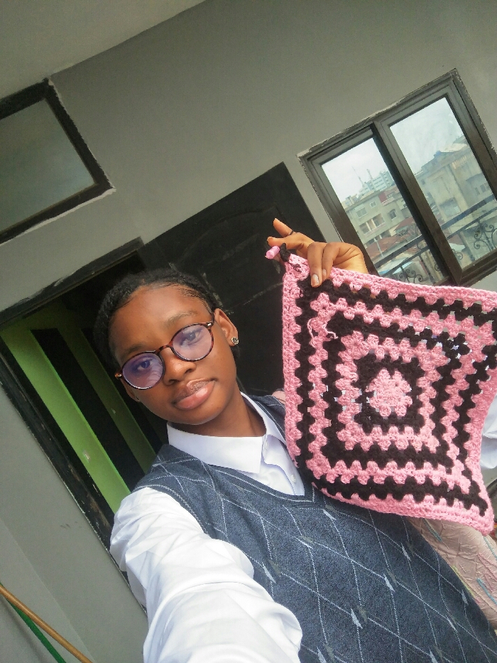 A young female subject is depicted indoors, framed against a light grey wall. She has dark hair styled in braids, wears round, dark-framed glasses, and a small stud earring in her right ear. Her attire comprises a white collared shirt and a dark grey V-neck sweater vest with a diamond pattern. Her lips are glossed. The subject holds a square-shaped crocheted item in her right hand. This item exhibits an alternating pattern of light pink and dark brown yarn, forming concentric squares. The background features a dark-framed opening to the left and a large, dark-framed window to the right. Beyond the window, an urban environment is visible, characterized by multiple concrete or stucco buildings, suggesting an elevated view within a city. The setting is identified as Cotonou, Benin.