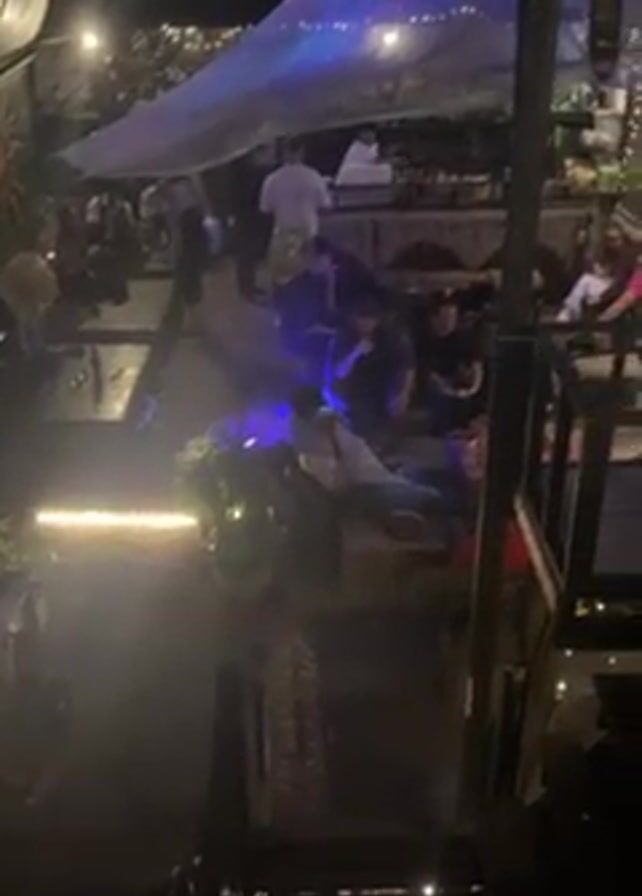 The video depicts an elevated perspective of a multi-level outdoor establishment at night, possibly a bar or lounge