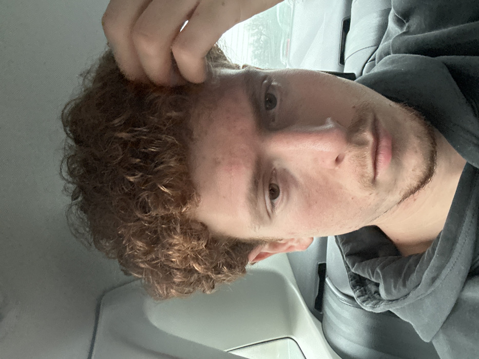 A young man with curly auburn hair and light skin looks directly at the camera, partially sideways. His hand is above his hair. He has light brown eyes, a thin mustache, and a sparse beard. The background appears to be the interior of a car, featuring light gray elements and a seatbelt. He wears a dark gray hooded sweatshirt.