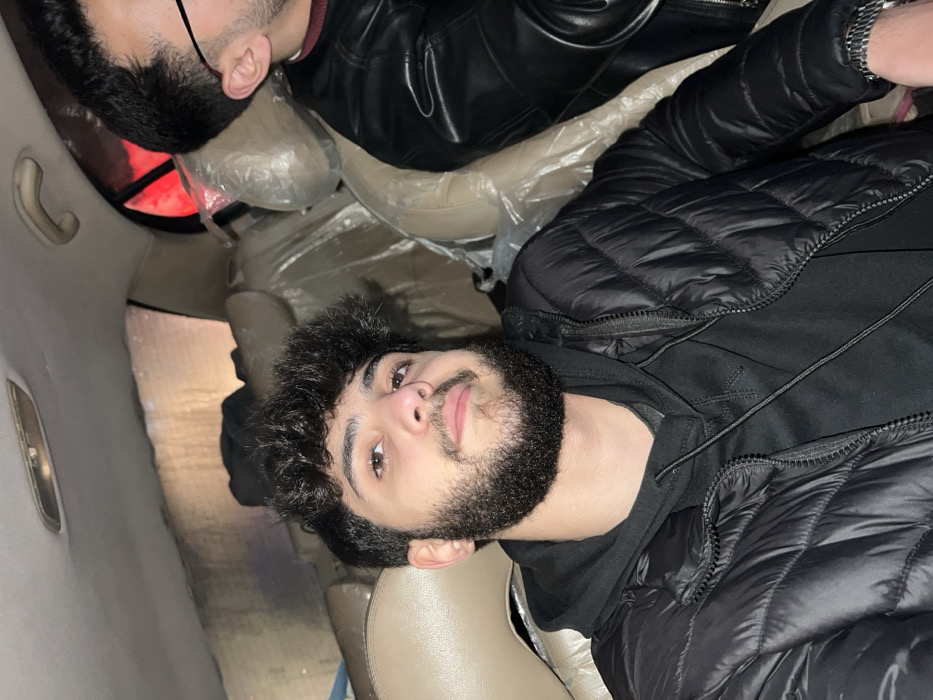 Two men are in a car. One is facing the camera, clad in a black puffer jacket and hoodie. He has dark, curly hair and a well-groomed beard. Behind him, the other man wears a black leather jacket and glasses, with just the top of his head and shoulder visible. The car's interior includes beige leather seats, some still wrapped in plastic. The car door and window can be seen in the background.