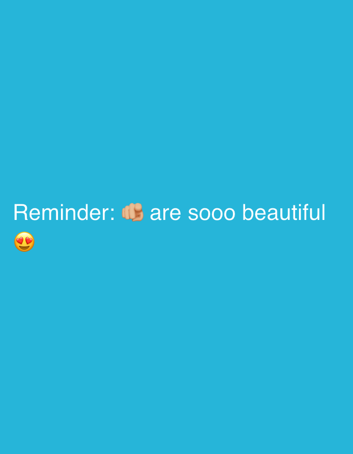 The digital image, originating from Gyumri, Armenia, features a uniform light blue background. White text centrally displays the phrase 'Reminder: [pointing fist emoji] are soooo beautiful'. Specifically, a light-skinned fist emoji pointing towards the viewer is positioned between 'Reminder:' and 'are soooo beautiful'. Below and to the left of the 'Reminder:' text, a standard yellow emoji face with two red heart-shaped eyes is visible. The scene is entirely graphic; no physical environment, individuals, or physical objects are depicted.