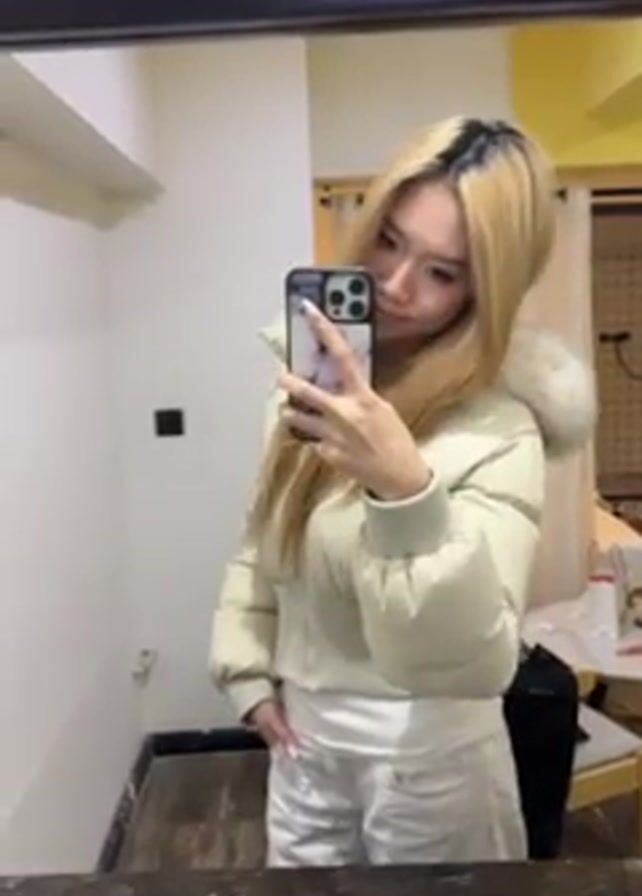 young Asian woman taking a selfie in a mirror. She has blond hair with dark roots, wears a white puffer jacket with a fur-trimmed hood, and light-colored pants. She holds a phone in her right hand with a case that has a picture on it. The background includes a bathroom sink and counter in the foreground and a room with a desk and chair in the background. The lighting is bright.