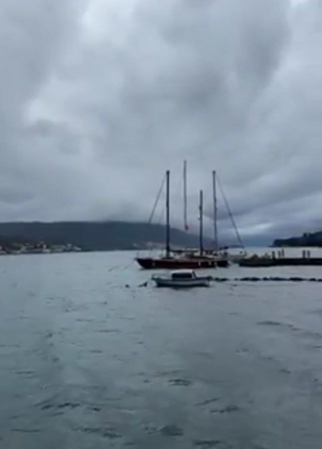 The video depicts a tranquil sea under a cloudy, overcast sky. A large, dark-hulled sailboat with three tall masts is the focal point, moored near a dark, low pier. A small, white boat is also visible near the sailboat. The water is choppy, reflecting the somber light from above. In the distance, a coastline dotted with buildings and a low, forested hill can be seen. The overall mood is calm and overcast.