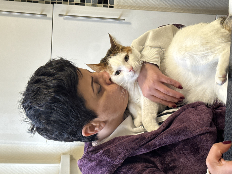 - "An individual with short, dark hair is depicted indoors in Strasbourg, France, holding a domestic cat and kissing its head" by FM-9wXCm1, licensed under CC BY 4.0