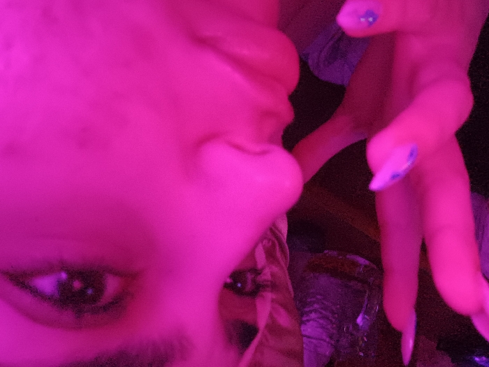 A close-up image, illuminated by strong magenta light, captures the right side of a person's face and their left hand. The scene is attributed to Gorna Oryahovitsa, Bulgaria. The subject's right eye, nose, and upper lip are visible on the right side of the frame. The eye exhibits a dark iris and pupil, with a small magenta light reflection. The nose is prominent, and the skin texture appears smooth under the intense lighting. The left hand, positioned on the left side of the image, displays long, manicured nails on the thumb, index, and middle fingers. The nails are elongated, with a pointed or almond shape, and feature small blue or purple heart-shaped designs. The index finger appears to be lightly touching or resting against the side of the person's nose. In the blurred background, behind the hand and face, indistinct objects are discernible. These include a partial view of a clear glass or bottle containing a dark liquid in the upper left, and suggestions of fabric or textured surfaces, possibly clothing or upholstery, further back, all bathed in the pervasive magenta light. A lighter-colored garment is faintly visible in the lower background.