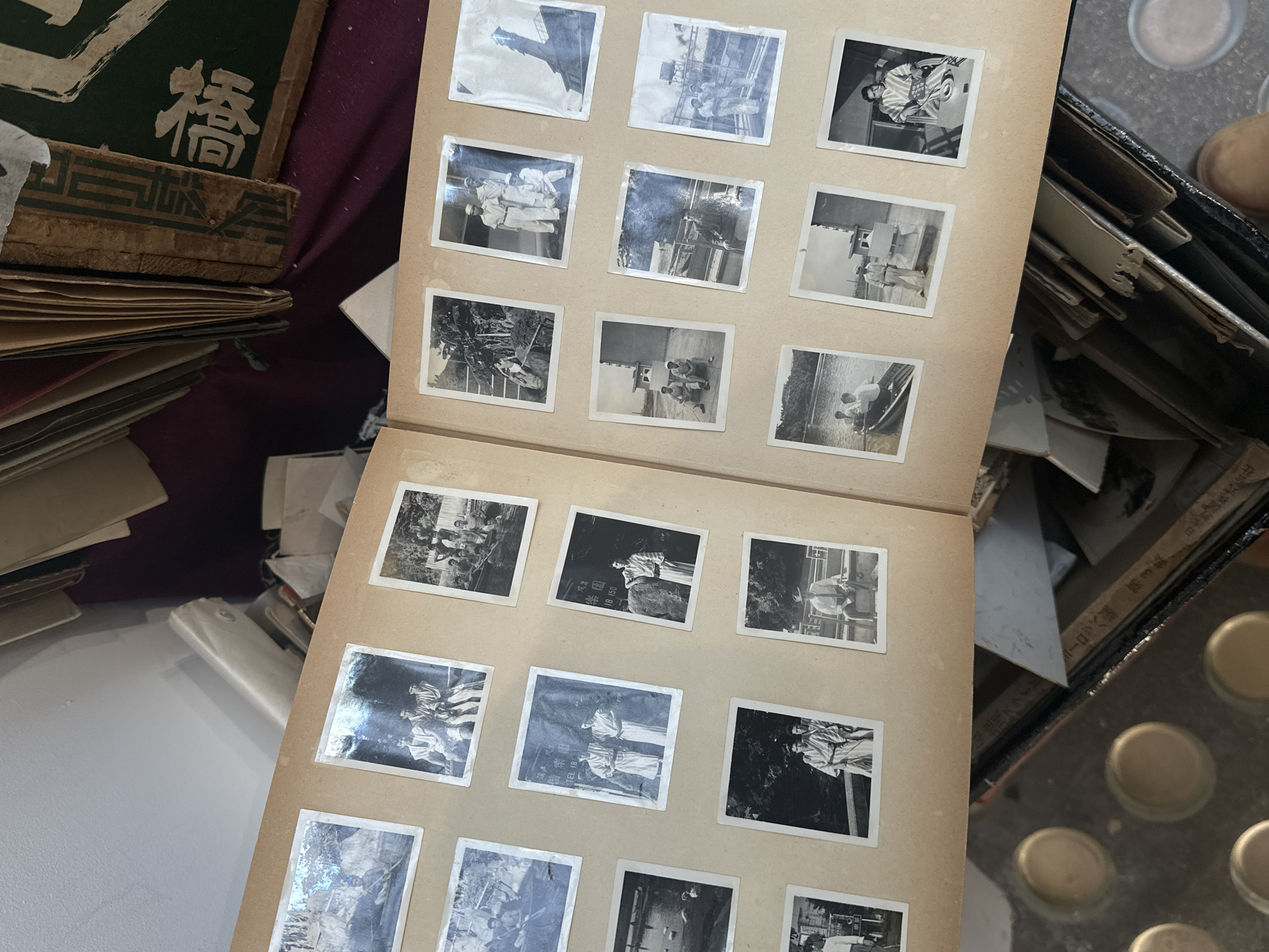 This image captures an overhead view of an open, aged photo album, situated amidst various old books and miscellaneous objects in a location in the city of Paris, France