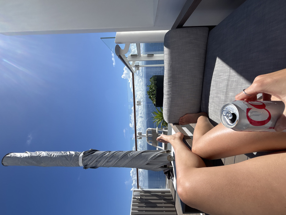 The image depicts an outdoor lounge area overlooking the open ocean under a bright, clear blue sky. No city or landmass is visible, therefore, the location specified as a city in Cuba cannot be confirmed. The scene appears to be at sea, possibly on a cruise ship or a coastal resort balcony. In the foreground, the lower half of a person's body is visible, with legs extended and slightly bent, resting on a gray, upholstered outdoor chaise lounge. The person's right hand holds an open, silver-colored beverage can, likely a "Coke" product, with condensation visible on its exterior. A simple silver-colored ring is present on the ring finger of the right hand. Portions of the chaise lounge are illuminated by sunlight, while other parts are in shadow, indicating a strong light source from the upper right. In the midground, a dark-colored, slatted outdoor table is visible to the left of the chaise. Further back, a tall, gray, cylindrical object, likely a retracted outdoor umbrella or awning, stands upright. Beyond this, another light-colored outdoor chair with a white cushion is partially visible. A dark planter containing green foliage sits on the deck. The seating area is enclosed by a modern glass railing with a dark top rail and white vertical supports, providing an unobstructed view of the water. The background shows an expansive, deep blue ocean under a bright blue sky with scattered white cumulus clouds, particularly near the horizon. The sun's glare is prominent in the upper right portion of the sky. A white vertical structure, possibly a wall or column, borders the right edge of the frame.