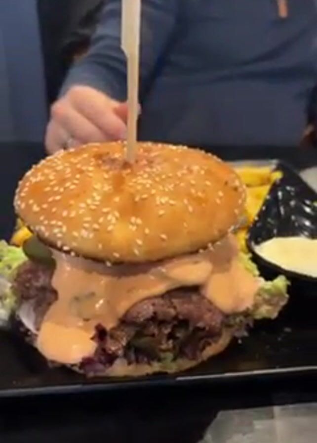 Here is a forensic description of the video: A close-up shot showcases a large hamburger on a black square plate
