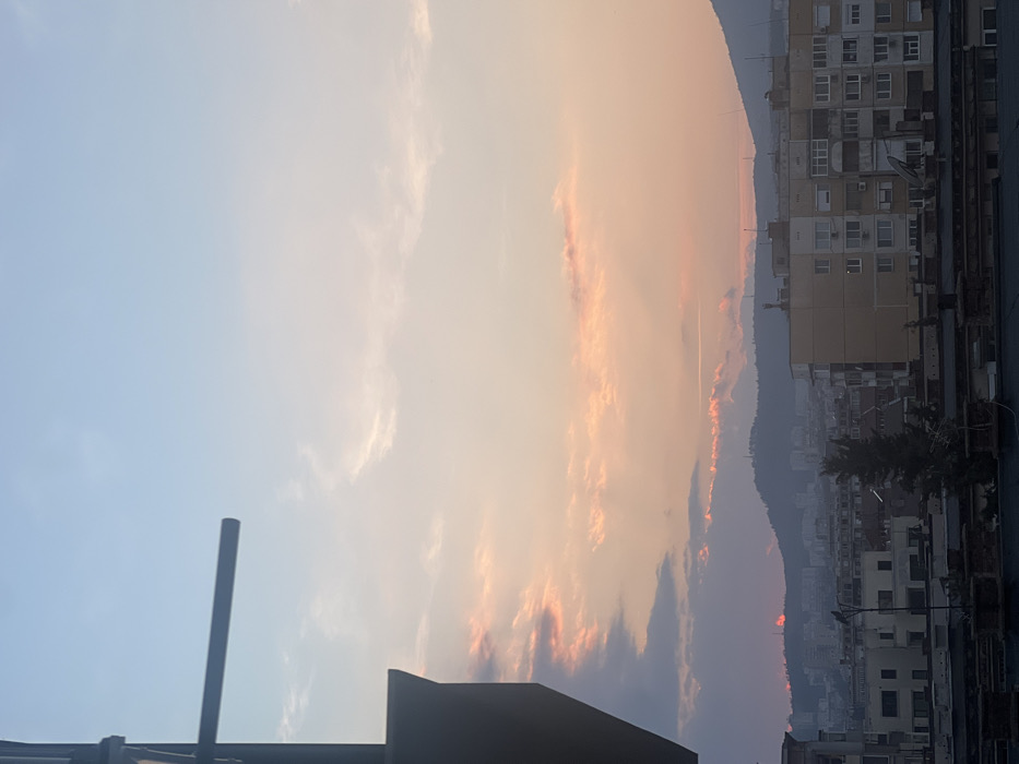 The image presents an elevated, panoramic view of Stara Zagora, Bulgaria, at a time corresponding to either sunrise or sunset. The sky transitions from a pale blue at the zenith to soft orange and pink tones near the horizon, with scattered clouds reflecting these warm colors. A prominent feature is the distant range of hills or mountains, silhouetted against the horizon, where multiple distinct areas of intense orange-red light are visible along their crests and slopes, indicative of active fires. The midground consists of a dense urban environment characterized by numerous multi-story residential buildings with various facades and visible windows, along with scattered trees. The foreground contains dark, partially visible architectural elements on the left, including a corner structure and a horizontal bar, suggesting the vantage point is from a building, and the dark rooftops of closer structures. No human figures or discernible actions are present within the frame.