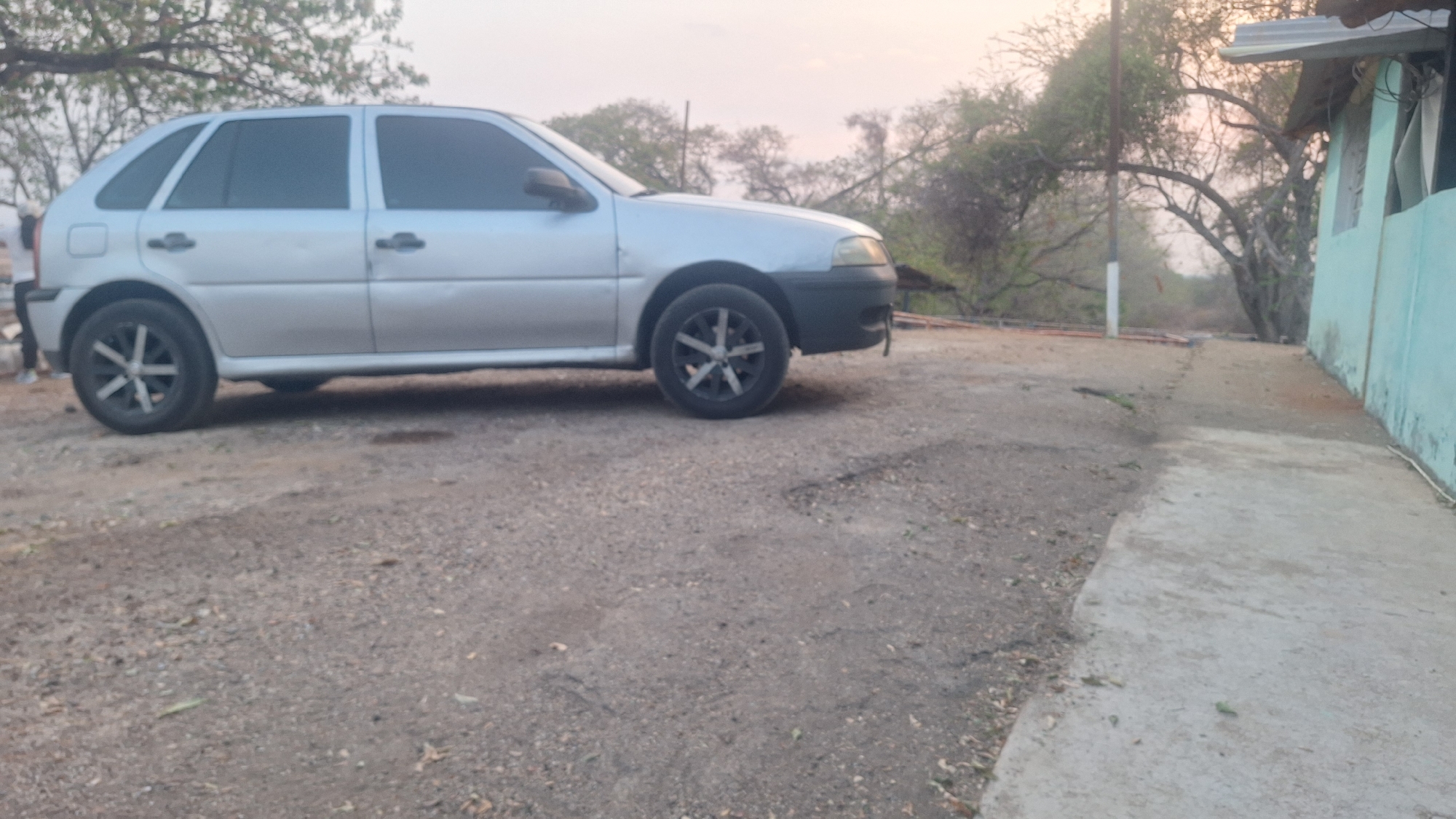 A silver four-door hatchback vehicle, featuring dark tinted windows, a black front bumper, and black multi-spoke wheels, is parked on an unpaved, gravelly surface in Las Tejas, Venezuela. The lower legs and feet of a person, wearing light-colored shoes, are partially visible behind the rear left wheel of the vehicle. To the immediate right of the vehicle, a narrow concrete pathway runs parallel to a structure. This structure has a light blue-painted wall with a visible window and a metallic corrugated roof overhang. White electrical wiring is affixed along the base of the building's wall. The background consists of a dense arrangement of deciduous trees with visible branches and sparse green foliage, suggesting a semi-arid or dry environment. A white pole, possibly a utility pole, stands vertically amidst the trees in the mid-ground. The sky above is hazy with a soft, warm, pinkish-orange glow, indicative of either sunrise or sunset.