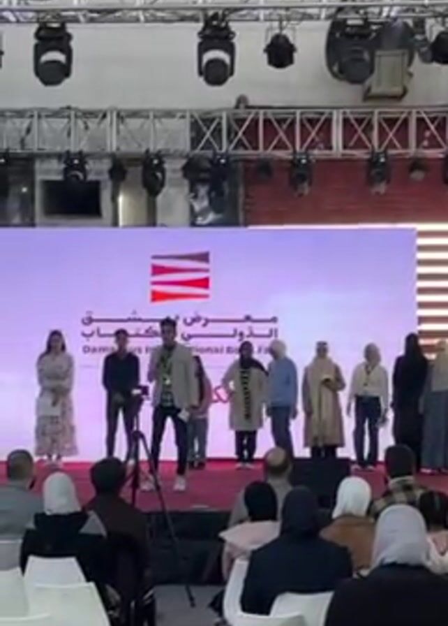 Certainly! Here's a description of the scene in the video: The video shows a group of people on a stage at what appears to be the Damascus International Book Fair