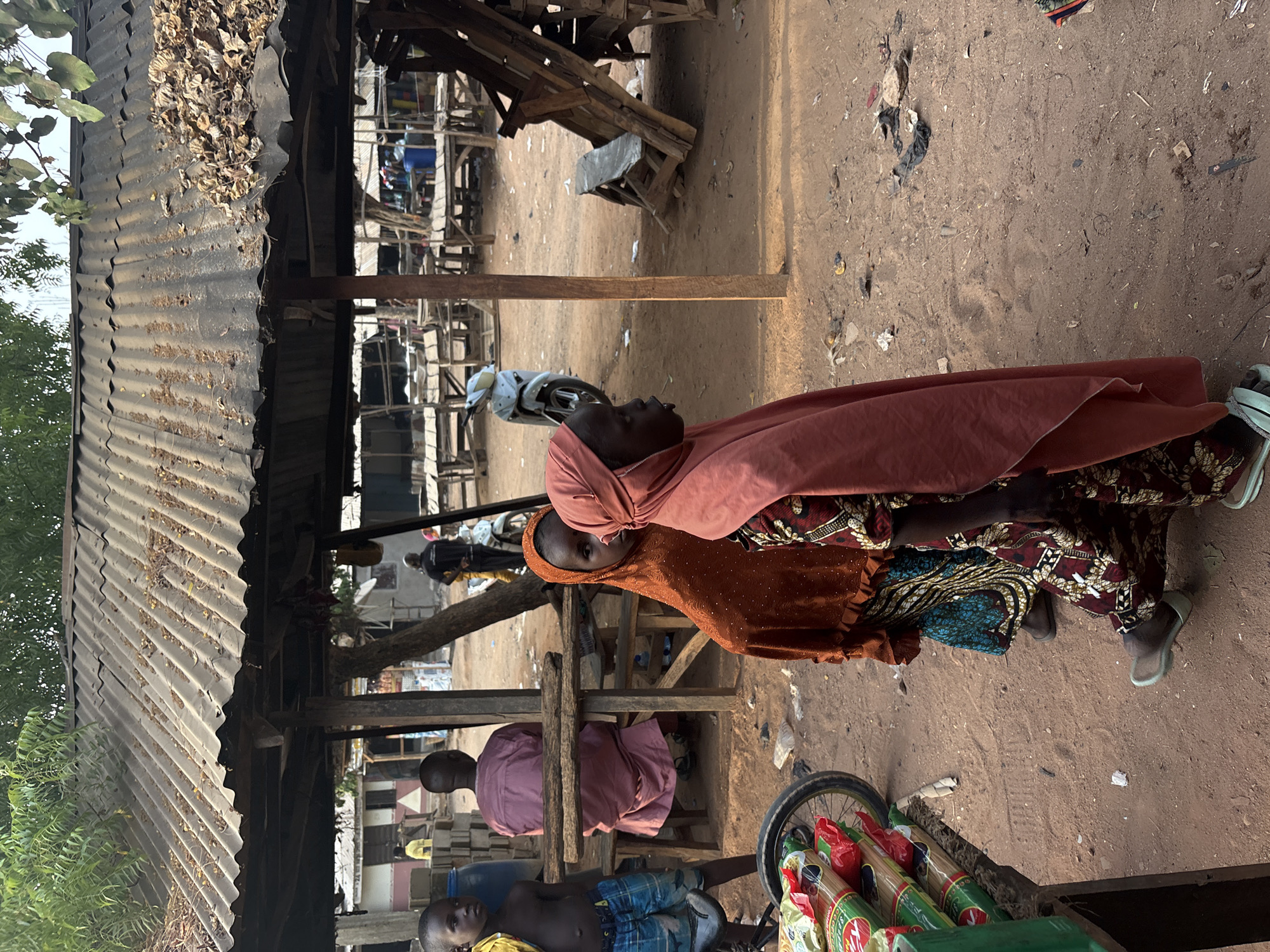 This image depicts an outdoor market scene in Lafia, Nigeria, characterized by a reddish-brown dirt ground and an overhead corrugated metal roof structure. The roof, weathered and partially covered with dried leaves and debris, is supported by rough-hewn wooden poles and a tree trunk. In the foreground, two young girls are prominent. The girl on the right, positioned in profile facing left, wears a rust-colored head covering (hijab) and a long, patterned dress featuring red, brown, white, and black designs. She wears light green sandals. Partially obscured behind her, a second girl with dark skin wears a brighter orange/brown head covering and a blue and black patterned dress, looking towards the viewer. She wears brown shoes. To the left, a young, shirtless boy in blue and white plaid shorts stands next to a green structure, possibly a market cart, laden with multiple packages of what appears to be pasta or noodles in green and red packaging. A bicycle wheel is visible adjacent to these packages. In the midground, an individual is seated from behind at a simple wooden table with a bench, wearing a loose-fitting, long-sleeved pink garment. Further back, numerous other unoccupied wooden tables and benches are scattered across the sandy ground, suggesting additional market stalls or seating areas. The background reveals a white scooter/motorcycle parked near a standing individual in dark clothing. Other distant figures and structures, including a building with a white and gray facade and blue barrels, are visible under a clear sky with scattered green foliage. The ground throughout the scene is covered in reddish-brown dirt with scattered litter, including paper and plastic debris. Natural daylight illuminates the scene, casting shadows.
