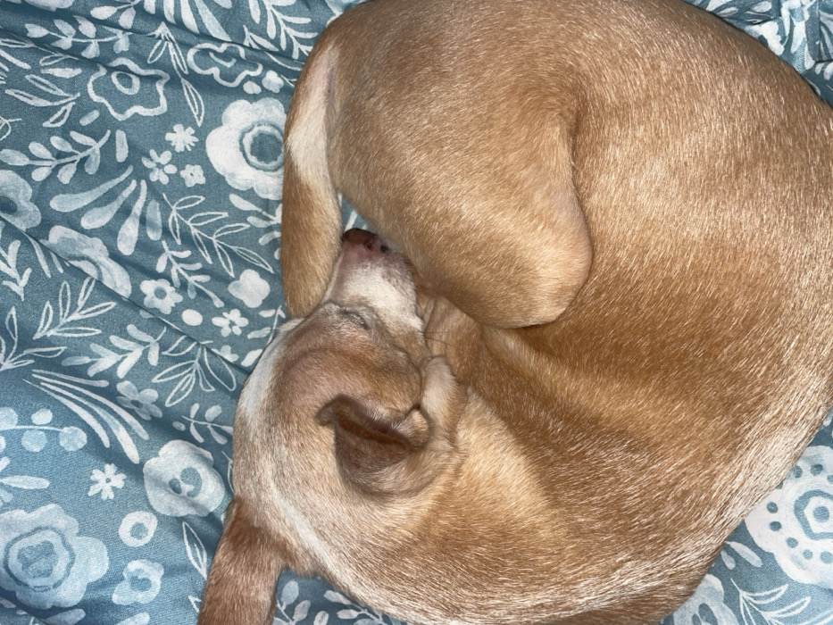 - "A light brown, short-haired dog is depicted curled into a tight sleeping position on a blue-green patterned textile" by FM-S3I4c2, licensed under CC BY 4.0