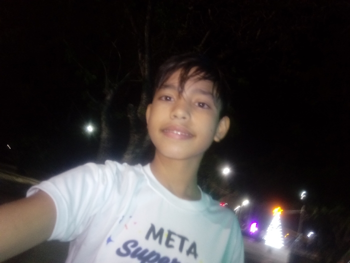 A young person poses at night with a blurred background featuring a lit-up Christmas tree. The person is wearing a white t-shirt with blue text. The lighting is dim, with streetlights and the Christmas tree providing the main light sources. The surrounding area appears to be a park or outdoor space, with trees visible in the background.