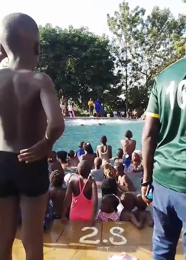 group of children in a swimming pool. They appear to be sitting or standing in the shallow end of the pool. Several adults are standing on the pool deck. The pool is surrounded by trees and other people can be seen on the far side of the pool. The video appears to be taken from the edge of the pool with the pool depth of 2.8 marked on the pavement. One of the adults on the deck is wearing a green shirt with a number 16 on the back. A child is swimming across the pool, and an adult appears to be monitoring them from the far side. People are cheering in the background.