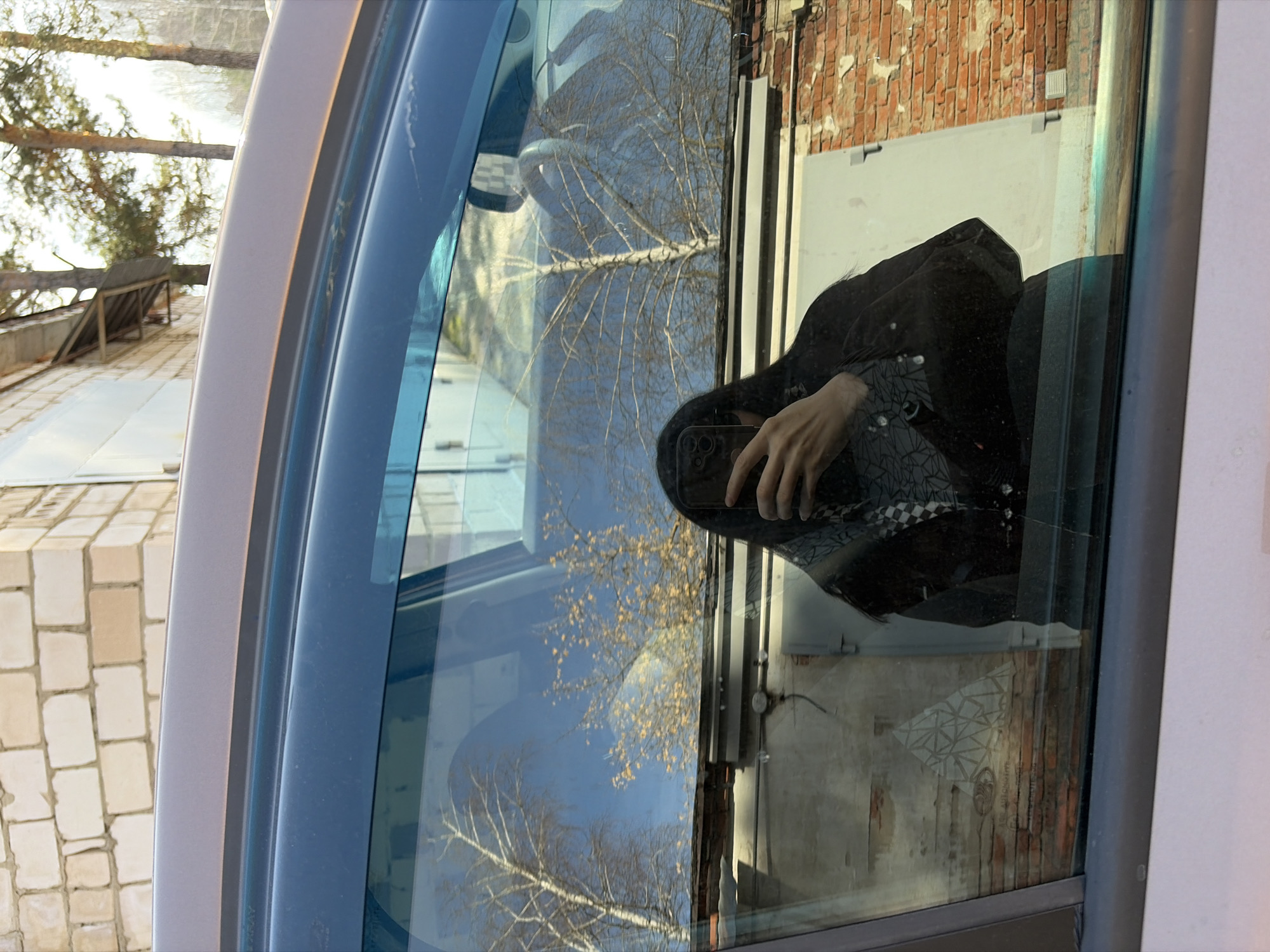 A reflection in a car window shows a person taking a picture of the reflection with a smartphone. The reflection includes bare trees against a blue sky, the side of a building with exposed brick and light-colored panels, and part of a parking lot or sidewalk. The car's interior is visible, along with the person's hand and clothing, which is dark-colored with a light-colored pattern. The location appears to be Chaikovsky, Russia, given the building style and foliage.