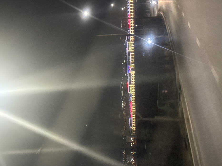 Night shot, rotated 90 degrees, displays a bridge adorned with vibrant lights in red, yellow, and blue hues. A road runs alongside the illuminated bridge. Streetlights cast streaks into the foggy, dark sky. Below the bridge, a cityscape twinkles with numerous lights, suggesting an urban area. The lighting creates a striking contrast against the dark sky and surrounding fog.