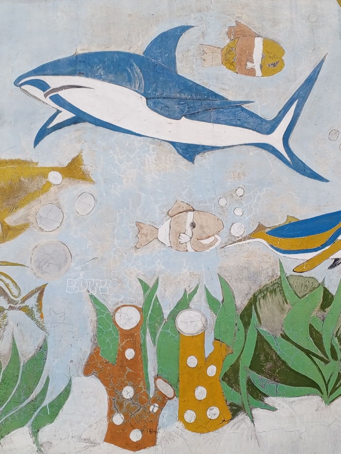 A mural painted on a cracked, light-blue wall in Voa Yeav, Cambodia, depicts an underwater scene