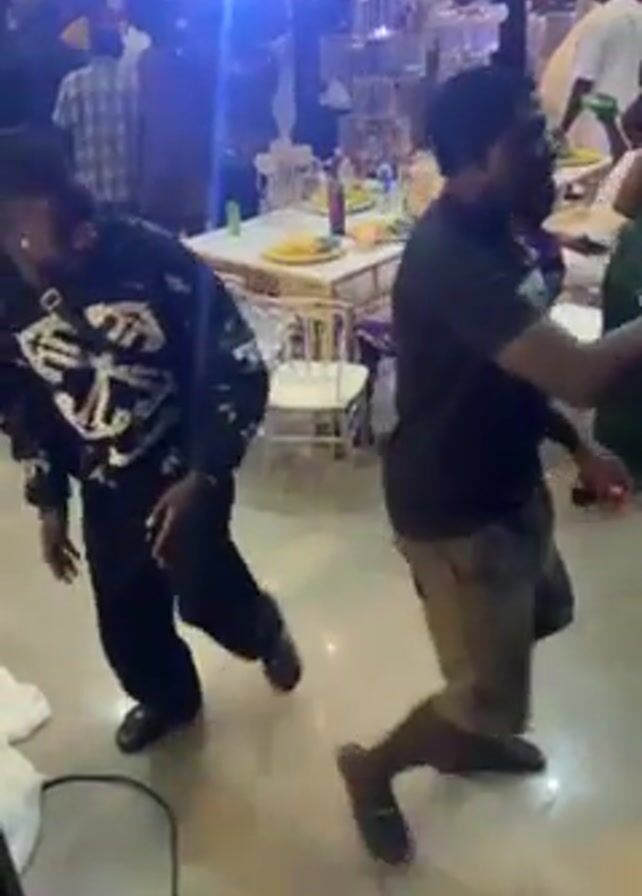 two men dancing at a crowded event. The event seems to be a reception with round tables covered in white tablecloths and adorned with decorations. The room has a white floor and bright, possibly LED lighting. The first man, wearing a black and white patterned sweatshirt and black pants, moves rhythmically to the music. The second man, in a black t-shirt and khaki shorts, also dances but remains close to a black box or speaker. People are seated at the tables around them.