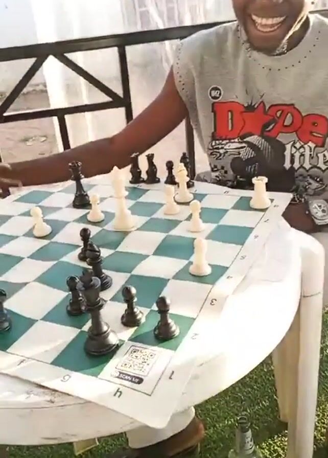 two young men playing chess on an outdoor patio. The chessboard is laid out on a small white round table with a green and white checked pattern. One of the players is wearing a gray sleeveless shirt and is smiling, while the other player is wearing a red shirt and his face is not clearly visible. An empty beer bottle sits near one player’s feet. The patio has a black metal railing and a green patch of artificial grass. The video is shaky and the camera moves, panning over the scene.