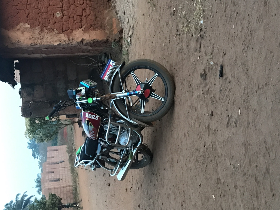 A motorcycle with a distinctive red and black paint scheme, prominently displaying the number "2025," stands parked on a dirt surface. The motorcycle features chrome accents, including a protective cage around the engine and front and rear fenders. A rustic, earthen building stands adjacent to the motorcycle. In the background, partially constructed brick structures are visible amidst scattered trees. The setting suggests a rural or developing area.