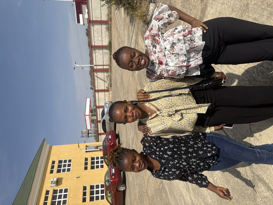 Three young adult females are depicted standing outdoors in a paved area, under a clear blue sky, in what appears to be a commercial or institutional setting in Jos, Nigeria