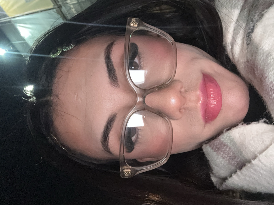 A woman's face dominates the frame, tilted slightly. She wears clear-framed glasses. Her makeup includes filled-in eyebrows and glossy pink lips. A small, circular hair clip is visible in her dark hair. Part of a white, textured fabric, possibly clothing, is seen in the corner of the image. Light reflections appear on the glasses and hair, indicating an indoor setting with light sources.