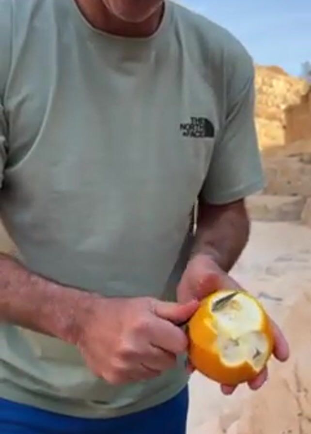 A man in a light green t-shirt, blue shorts, and glasses peels an orange with a small knife. He holds the orange in his left hand and uses the knife in his right hand to cut into the peel. The man is focused on the task, looking down at the orange. In the background are light brown, rock-like formations and some steps. The t-shirt has “THE NORTH FACE” written on it.