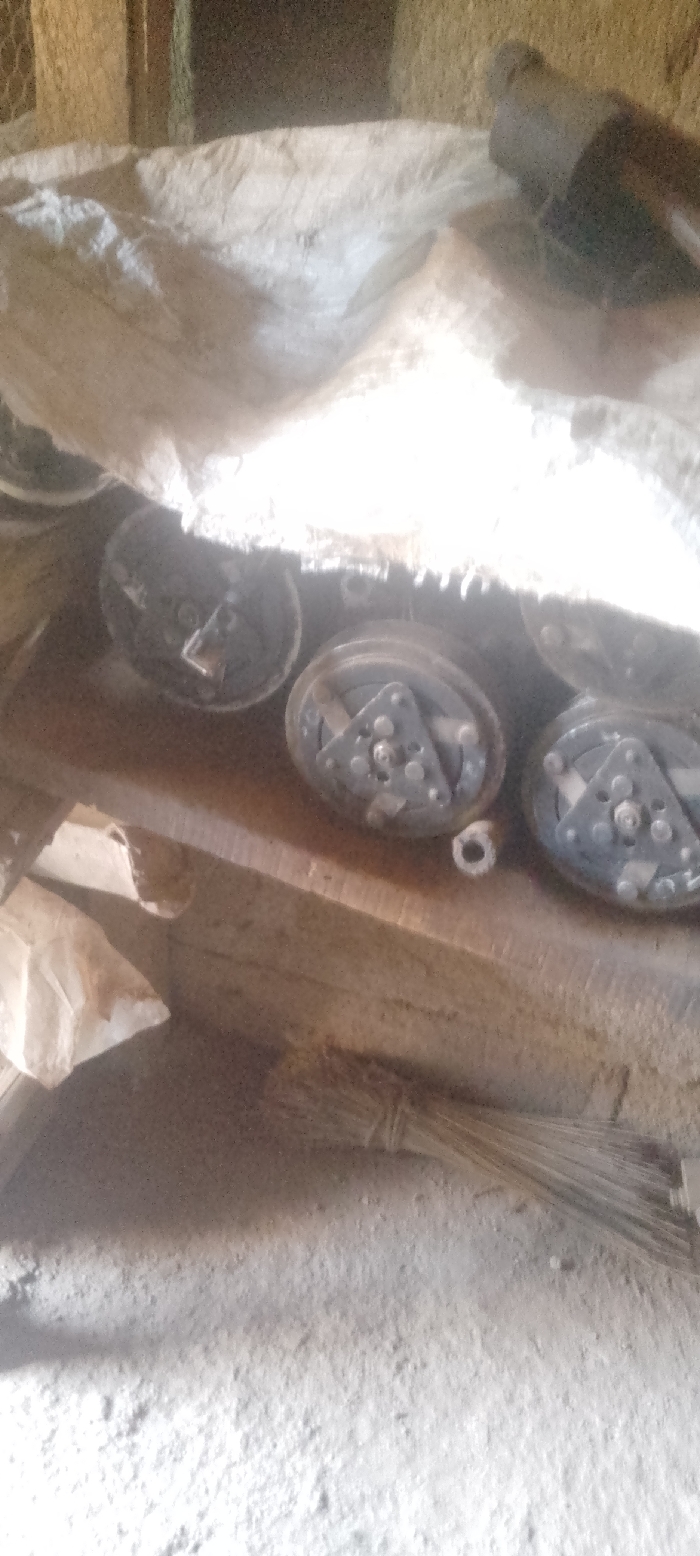 A cluttered, dimly lit space reveals a makeshift shelf holding several dark, round objects, possibly automotive components, partially obscured by a light-colored, wrinkled fabric or covering. A small, separate ring or fastener sits next to the objects. A bundle of thin sticks, resembling a broom or brush, lies beneath the shelf. The floor appears to be concrete or a similar rough, light-colored material.