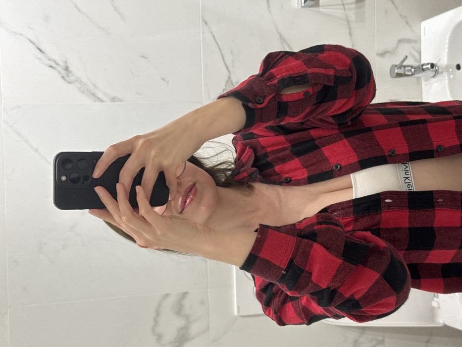 A mirror selfie depicts an individual within a private bathroom environment in Scafati, Italy. The person, positioned centrally, holds a black smartphone with both hands, obscuring the individual's upper face. The visible facial features include the nose, glossy lips, and chin, with portions of eyeglasses visible. Brown hair frames the visible part of the face. The individual is wearing an unbuttoned red and black plaid flannel shirt, revealing a white athletic bra with an inverted "Calvin Klein" logo on its band. Visible cleavage is present. The mirrored background features white tiles with grey marble veining. In the lower right of the reflection, a white ceramic basin with a chrome single-lever faucet is present. A white rectangular fixture, consistent with a toilet cistern, is partially visible to the left of the basin. A small chrome fixture is mounted on the wall to the right, above the basin.