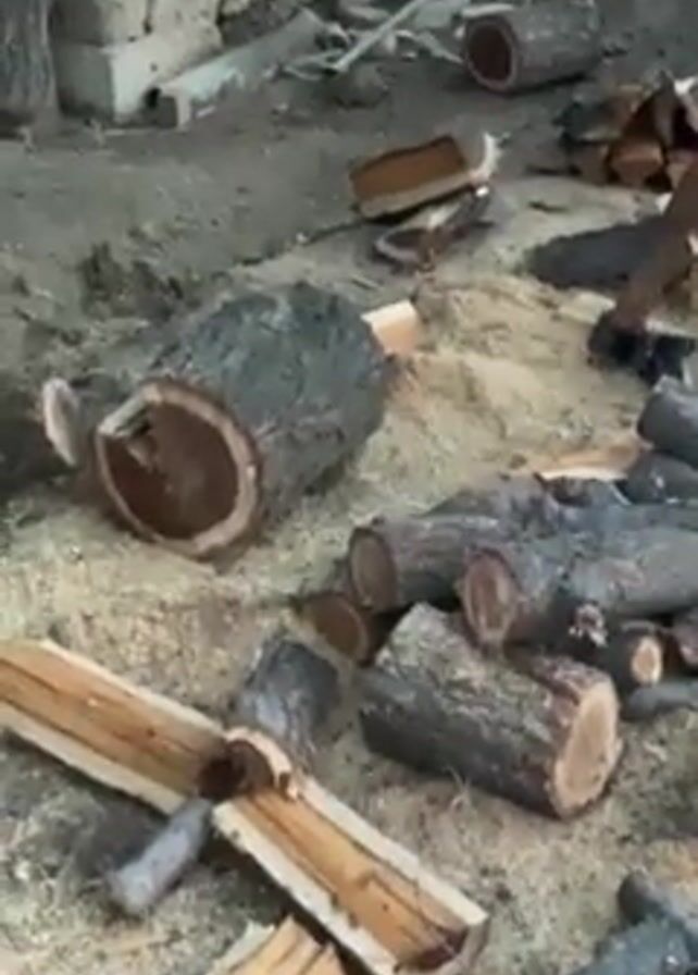 scene where firewood is being chopped. There are several pieces of logs and split wood scattered on the ground covered in sawdust. A person's hand and part of their arm appear in the frame as they pick up a piece of wood. The background includes a partially visible stone structure.
