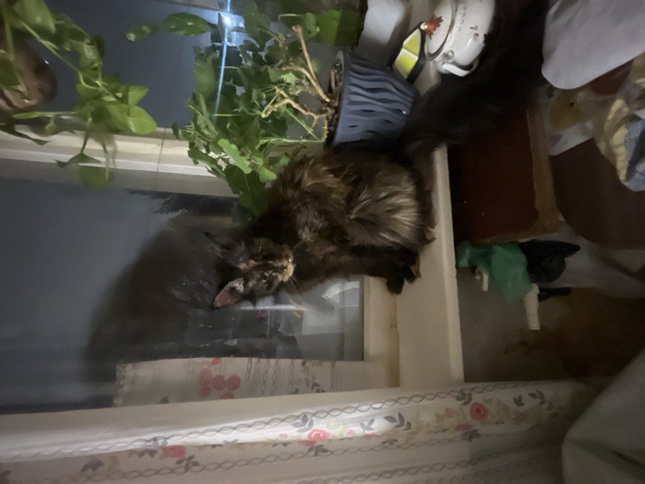 A fluffy brown and black cat sits on a windowsill with floral patterned curtains. The cat's shadow is visible on the window. Behind the cat, a plant with green leaves sits in a blue pot. A white teapot is next to the plant. The space appears cluttered with various household items.