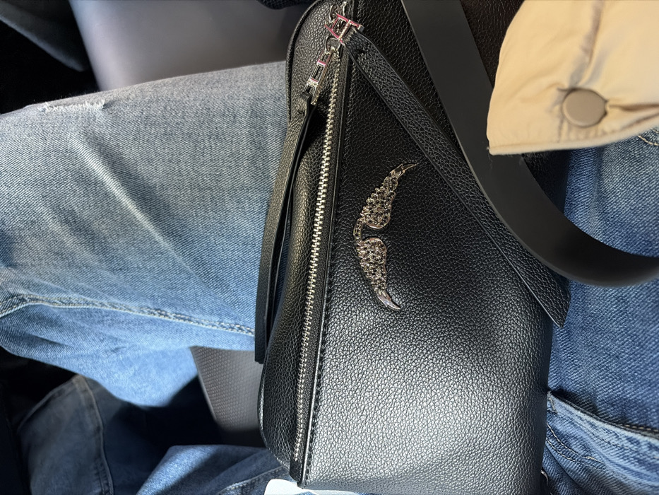 Light-wash denim jeans with slight distress at the knee are visible. A black leather handbag with a silver zipper and embellishment is positioned on top of the jeans. A beige padded jacket, fastened with a snap, is adjacent to the handbag, along with a thick black leather strap that crosses over the bag.