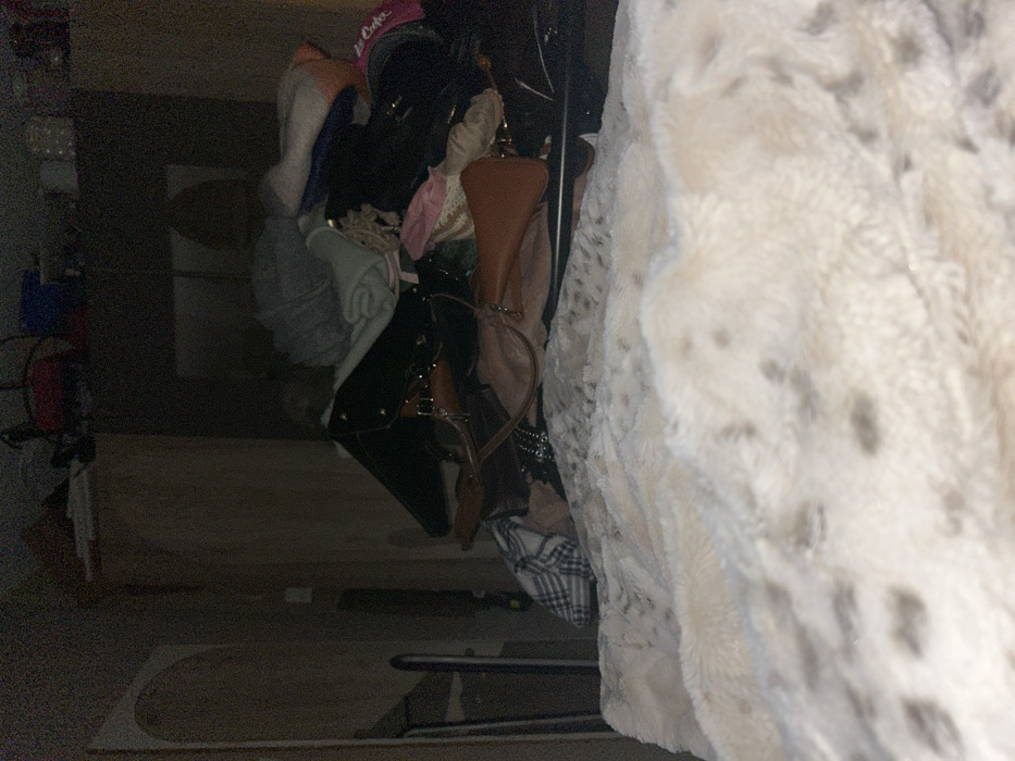 A dimly lit space features a rack overflowing with clothes, bags, and accessories. Hues of tan, black, pink, and white intermingle within the chaotic assortment. A soft, off-white blanket with subtle spotted patterns dominates the right side. The background reveals a cluttered area, possibly a closet or storage space, with glimpses of boxes and household items. The composition is slightly tilted, enhancing the feeling of disarray.