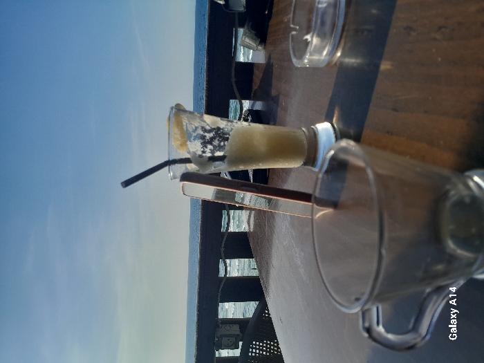 The scene depicts an outdoor setting at an unspecified location in Al-Mawasi. A dark, possibly wooden, rectangular table occupies the foreground. On the table, from left to right, are a clear, empty glass mug with a handle, a light-colored smartphone leaning against a tall glass, and a clear glass ashtray. The tall glass contains a partially consumed, condensation-covered yellow-green beverage with ice and a black straw, topped with a lemon slice. Beyond the table, a dark railing separates the immediate area from the ocean, where waves are visible. The horizon line shows the expanse of the ocean meeting a clear blue sky. Natural daylight illuminates the scene, casting shadows to the right of the objects on the table. No individuals are present.