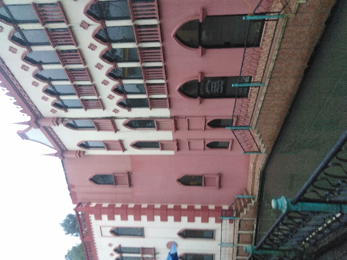 The image displays a multi-story building complex with Venetian Gothic-inspired architecture, situated alongside a canal in Ciudad de San José, Costa Rica. The buildings are predominantly colored in light pink/mauve, accented with off-white/cream trim. The taller structure on the right features multiple levels of narrow, tall windows with pointed Gothic arches; some windows on the upper levels have small, light-colored balconettes with short balustrades. Intricate decorative elements, including pointed finials, adorn the roofline and upper facades. The attached shorter building on the left exhibits similar architectural characteristics, with prominent off-white block-like trim. A narrow canal, filled with dark green water, runs horizontally across the foreground, its banks constructed from reddish-brown brick-like material. Steps descend from the building's base to pathways alongside the canal. Black metal railings with decorative scrollwork and turquoise posts border these pathways and steps. The sky above is overcast. No individuals are present in the scene.