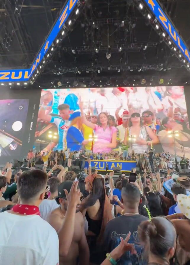 A large crowd is gathered at an outdoor concert, with a massive screen displaying colorful, abstract visuals. The stage is adorned with “ZULAN” in bold letters. Above the screen is an ornate triangle lit up with blue and gold lights. Attendees, mostly facing the stage, are dancing, raising their arms, and recording on their phones. The atmosphere is energetic and festive, characteristic of a music festival.