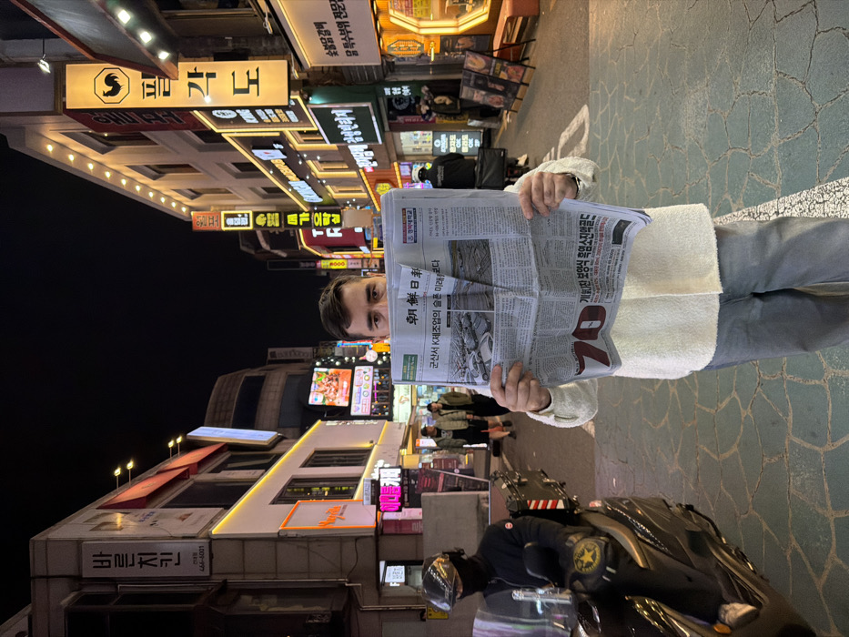 This image depicts a nighttime street scene in Myeongdong, Seoul, South Korea. In the foreground and center, a male individual with short dark hair, wearing a cream-colored textured long-sleeved shirt and light grey pants, stands holding an open copy of the Chosun Ilbo newspaper in front of his face. Only his eyes and forehead are visible above the newspaper's top edge. A large red "70" is prominently displayed on the lower left page of the newspaper. To the immediate left of the central figure, a person wearing a dark helmet with a reflective visor and a dark jacket sits on a dark scooter or motorcycle, facing left and slightly away from the camera. A black utility box is visible on the rear of the scooter. The street is paved with distinctive light green/blueish hexagonal interlocking pavers, marked by a faded white line running down the center. Multi-story buildings line both sides of the street, illuminated by numerous neon and backlit signs displaying Korean characters. On the left, a building features a "바른치킨" (Bareun Chicken) sign and "446-4001" phone number. Below it, a smaller orange sign reads "MAYFIELD." On the right, a prominent vertical sign with a rooster logo displays "필각도" (Pilgakdo). Other signs feature Korean and some English text like "KING." Further down the street, beyond the central figure, several other indistinct individuals are visible walking or standing amidst the brightly lit shops and restaurants. The sky above is dark, indicating a nighttime setting, with artificial light dominating the scene.