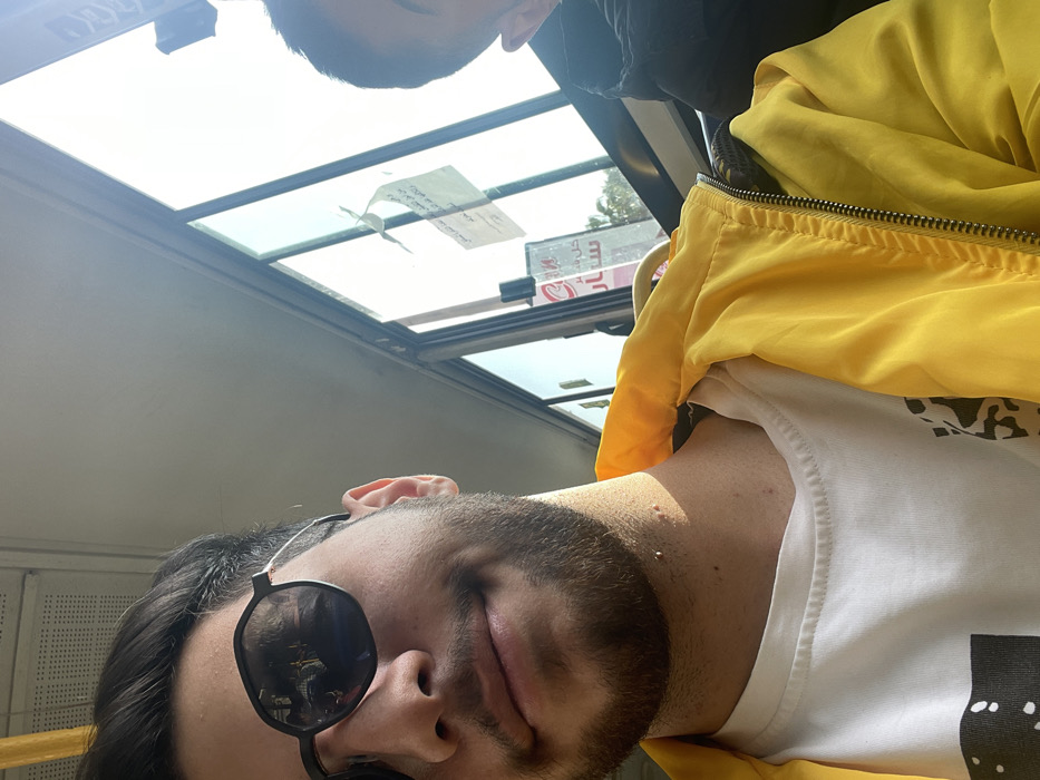 A selfie shot at an unusual angle features a man with dark hair, sunglasses, and a beard. He wears a white t-shirt and a yellow jacket. Above him is a skylight, with a reflection of a person in the top corner of the image. The environment looks like the interior of a vehicle, potentially a bus or train, with a sign visible on the glass panels.