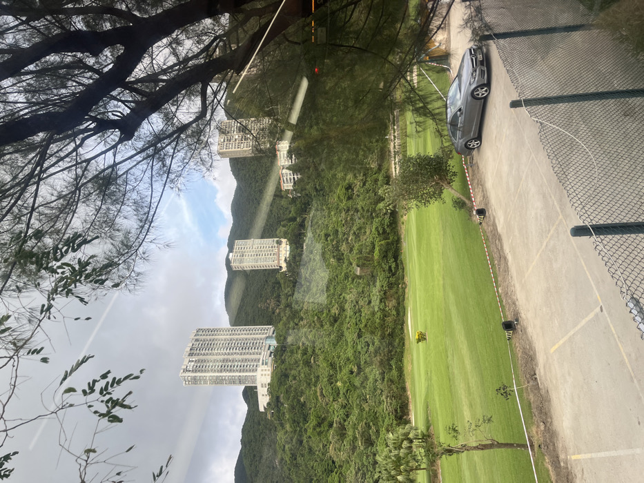 The image displays a panoramic view of a landscape on Hong Kong Island, China, likely in the Deep Water Bay area, characterized by a golf course, lush hills, and residential towers. In the immediate foreground, a dark green chain-link fence runs horizontally across the bottom, with a white cord woven through it. Above this, a light gray paved parking lot is visible, featuring faint white line markings. A silver Mercedes-Benz CLS-class sedan is parked on the right side of the lot, facing left with its front wheels slightly turned; no occupants are visible. A red and white striped barrier tape is stretched between two black and yellow bollards, separating the parking area from the adjacent golf course. Overhanging branches from a dark-barked tree obscure the upper right and parts of the left side, indicating the vantage point is partially obstructed, possibly from behind foliage or through glass, evidenced by visible light reflections and streaks. The midground features a meticulously maintained green golf course, stretching from left to center. A small, yellow-flowering bush stands isolated on the green, and a faint lighter patch, likely a sand trap, is visible further back on the course. To the left of the golf course, a thin, light-barked tree with green leaves stands. No individuals or active play are observed on the golf course. In the background, steep, densely forested hillsides covered in various shades of green foliage rise prominently. Situated on the lower slopes of these hills are several high-rise residential buildings. The most prominent, on the far left, is a tall, multi-story white building with numerous balconies. Further to the right and slightly recessed, another light-colored residential tower stands. A third, partially obscured residential structure is visible on the far right. The sky above is a mix of overcast gray clouds on the left and patches of clear blue on the right, with a faint white contrail or streak in the upper left quadrant. The scene is devoid of visible people or direct human actions.