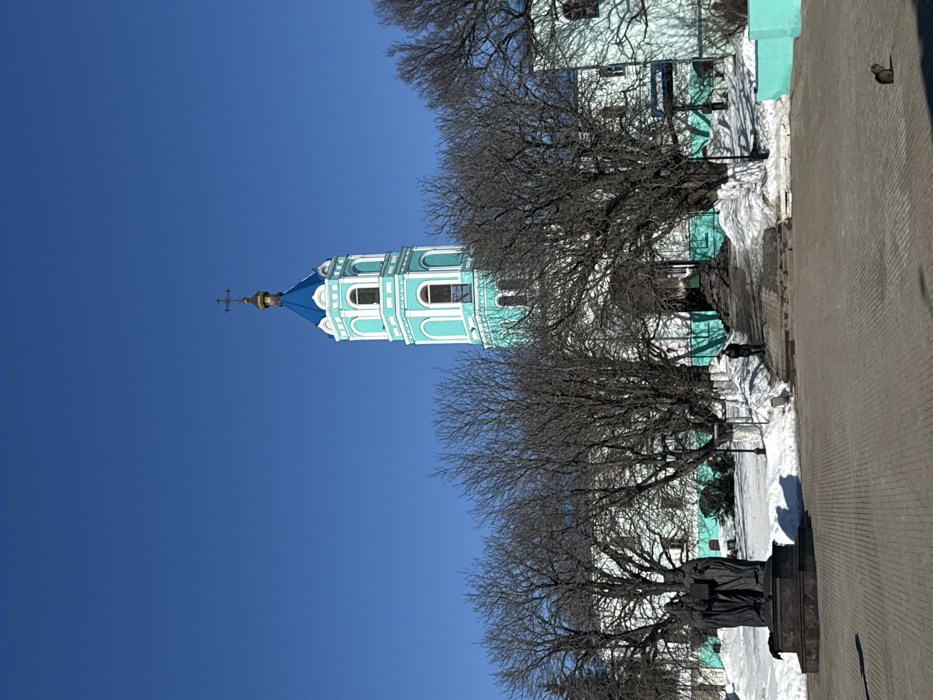 The image depicts an outdoor winter scene in the city of Svoboda, Russia, under a clear, bright blue sky. A prominent turquoise and white multi-tiered bell tower with a blue conical roof topped by a golden Orthodox cross dominates the upper half of the frame, indicating it is part of a religious complex. This bell tower is connected to other buildings, also painted turquoise and white, partially visible behind bare deciduous trees in the mid-ground. In the foreground, a paved plaza or courtyard, consisting of light-colored interlocking pavers, occupies the lower third of the image. Strong sunlight casts distinct shadows across this paved area from structures and trees to the left. In the lower left, a dark bronze monument stands on a pedestal, depicting multiple figures, possibly three, with one holding a book or tablet. Snow covers the ground in areas adjacent to the paved plaza and around the base of the buildings and trees. A set of snow-lined steps leads upwards towards the main building complex from the mid-ground. One individual, dressed in dark clothing, stands near the base of these steps. Further to the right, in the lower right corner of the paved area, a small, dark-furred animal, resembling a cat, sits facing left. Numerous bare trees with dark branches are scattered across the mid-ground, partially obscuring the lower portions of the buildings. White fencing or retaining walls are visible along the edges of snow-covered slopes.