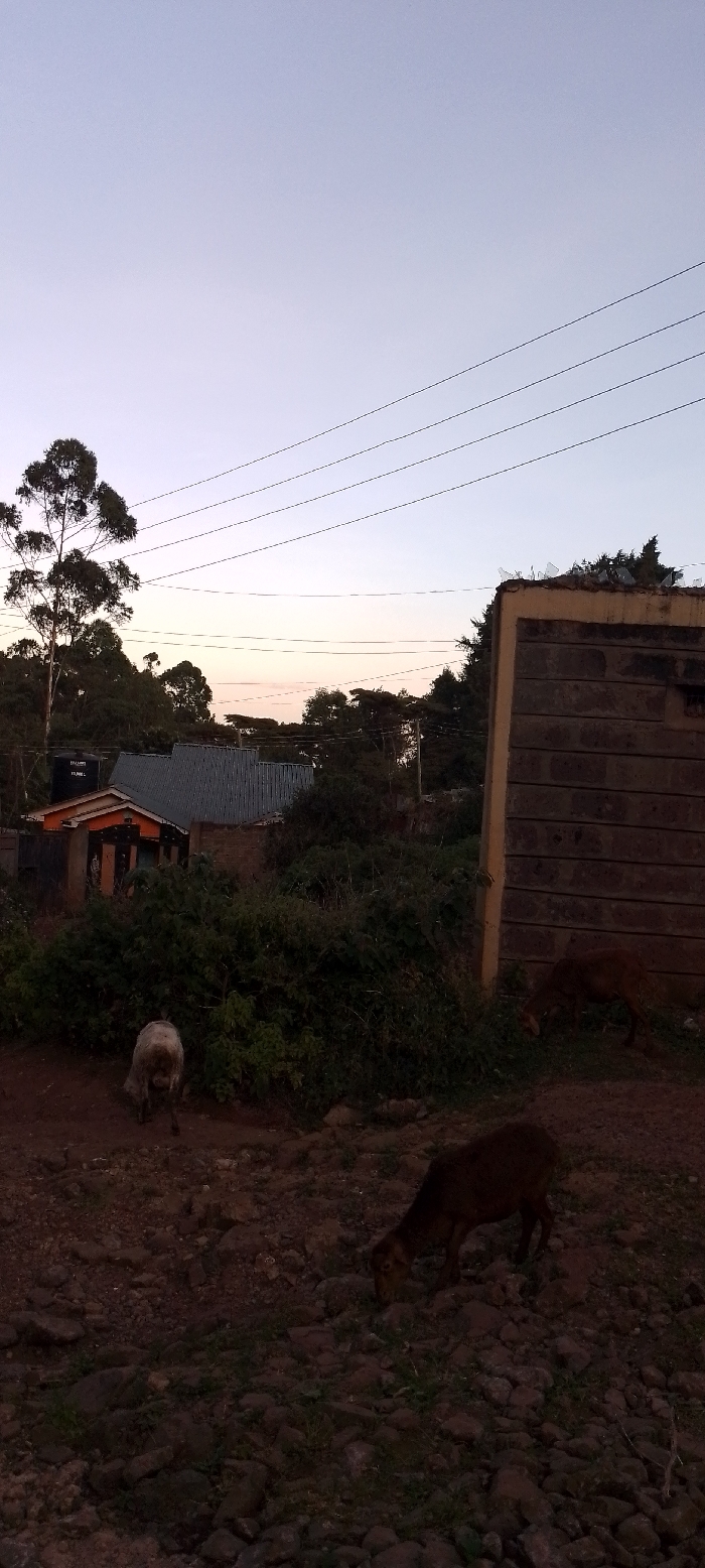 Underneath a muted, dusky sky crisscrossed by power lines, a pastoral scene unfolds. Three sheep graze in a rugged, rocky area, partially obscured by lush greenery. In the background, a glimpse of dwellings with corrugated roofs and a water tank hints at a small settlement nestled amongst the trees. A rough, brick wall juts into the frame on the right, its sharp edges adding an element of rustic contrast. The overall mood evokes a sense of quiet rural life at dusk.